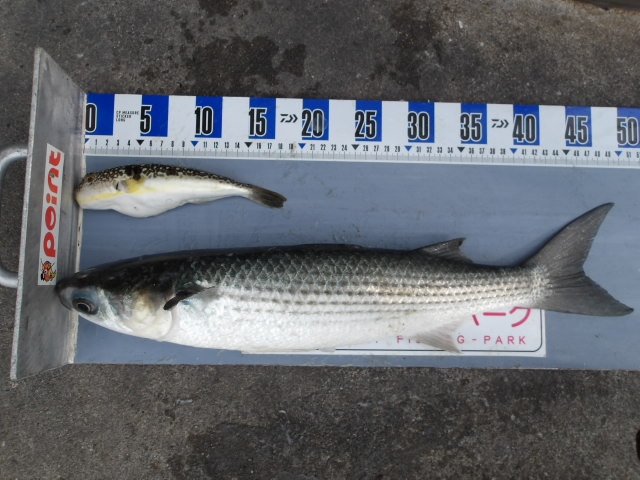 常連のお客様、50cmのボラ(その後も1匹で計2匹)とフグを釣られました。すごいっ!!