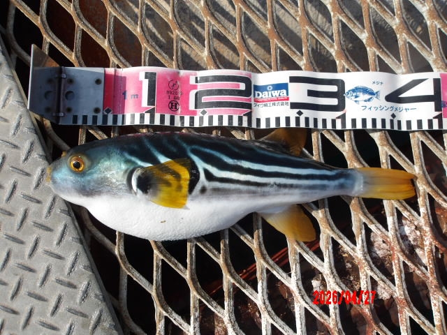 持ち込んだアジの泳がせでシマフグが釣れました。